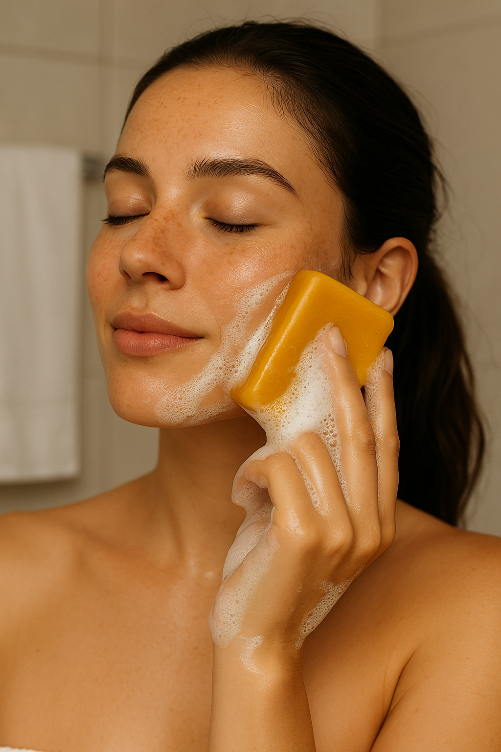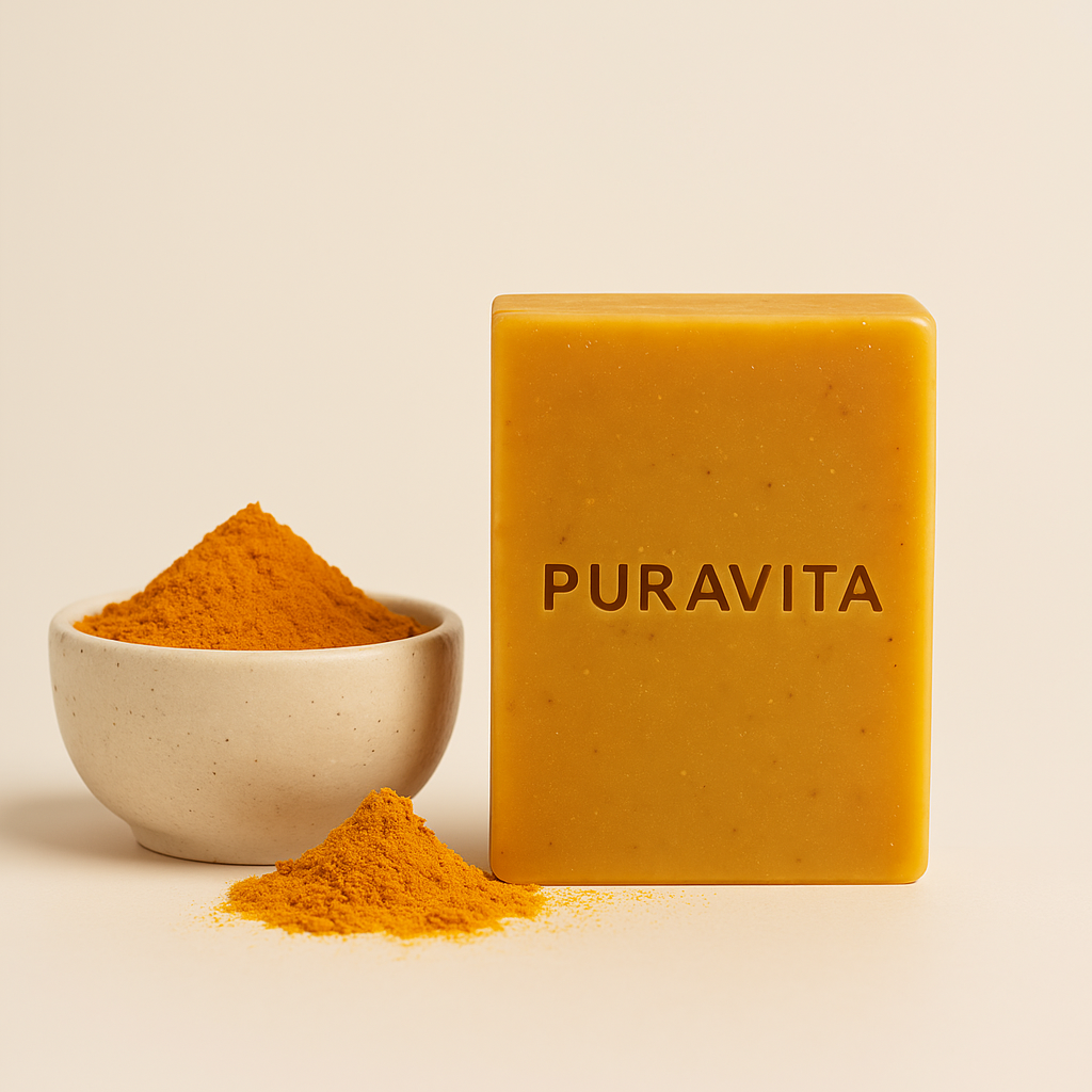 O Sabonete de Curcuma PURAVITA ajuda a reduzir as manchas, uniformiza o tom e devolve à pele a sua luminosidade natural — dia após dia.
